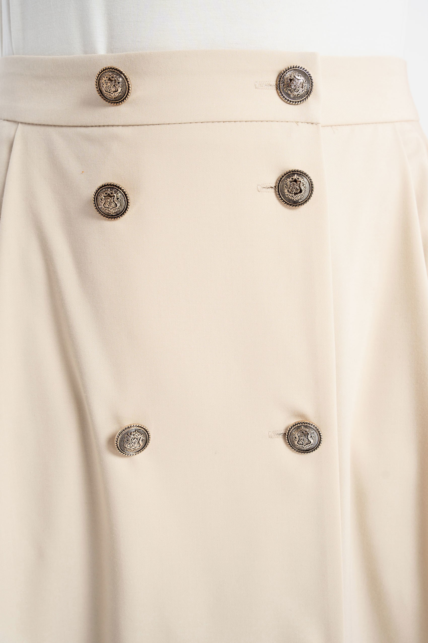 Charakterystyczny zakładany fason pięknie prezentuje się w ruchu, tworząc miękką, kobiecą linię, natomiast guziki z motywem delikatnego herbu to detal, który przyciąga uwagę i nadaje całości bardziej szlachetnego wykończenia.