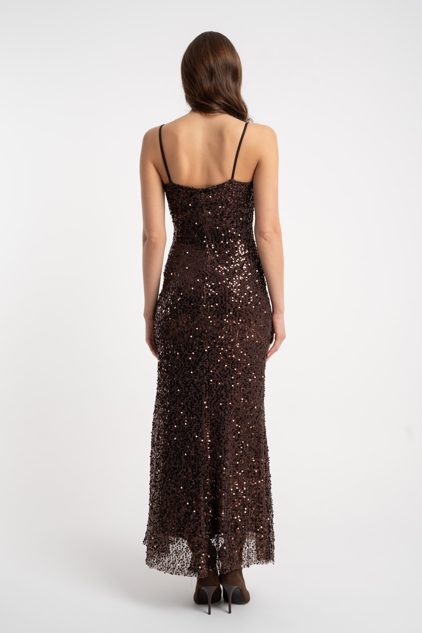 Ta niezwykła sukienka maxi wykonana z dzianiny pokrytej drobnymi, gęsto rozmieszczonymi cekinami w odcieniu głębokiego brązu to idealna propozycja na wieczorne wyjścia i wyjątkowe okazje - sylwester tuż tuż!