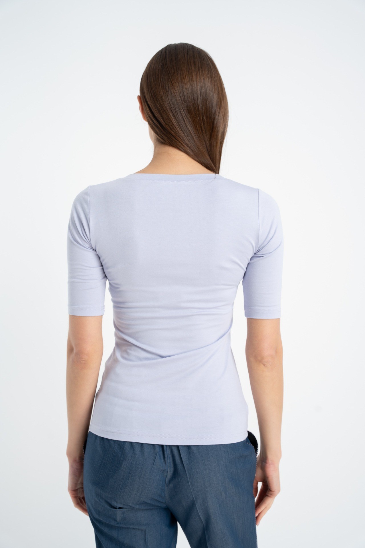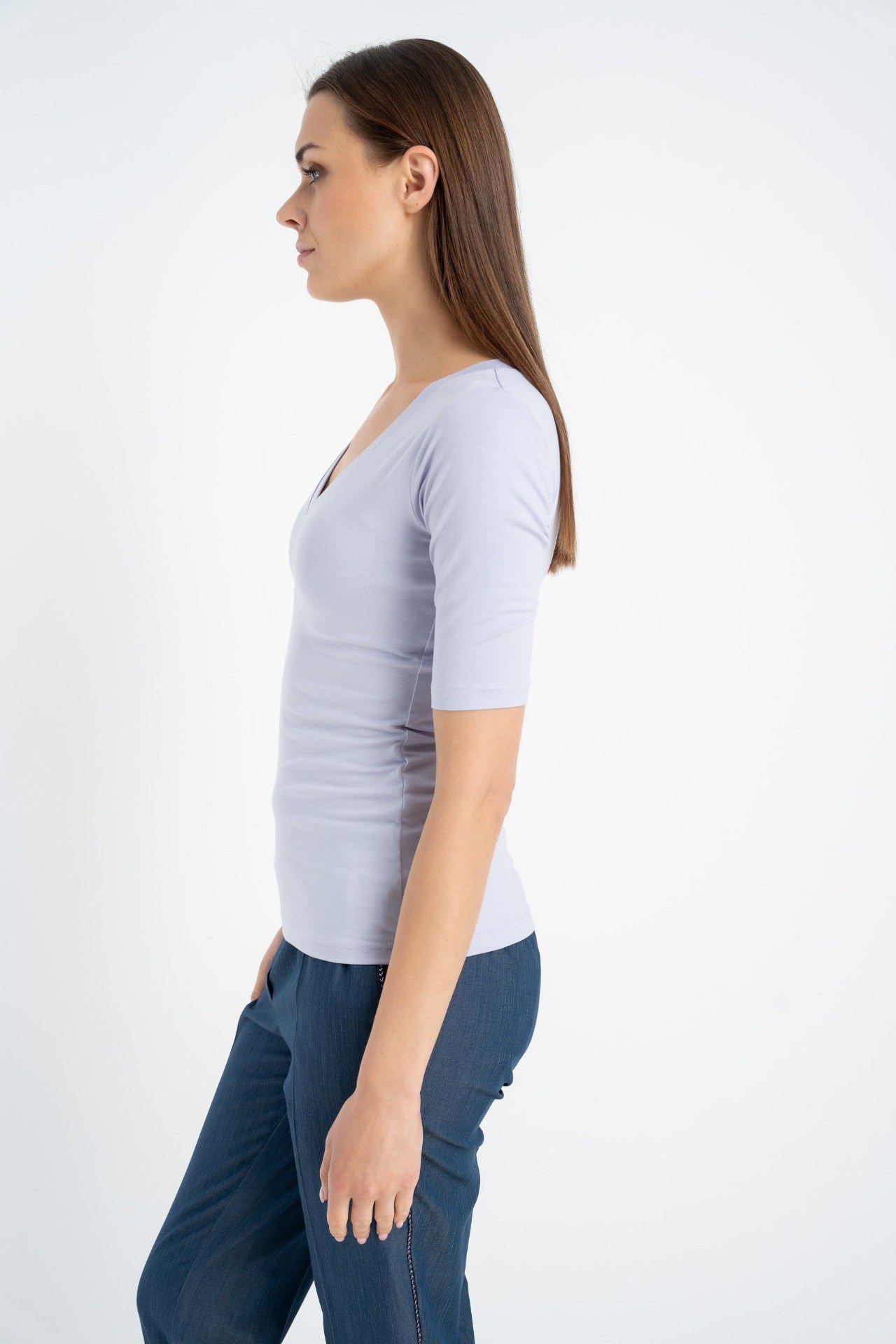Ponadczasowy model dopasowanego t-shirtu w kolorze wrzosowym z rękawami ¾ i dekoltem w serek.